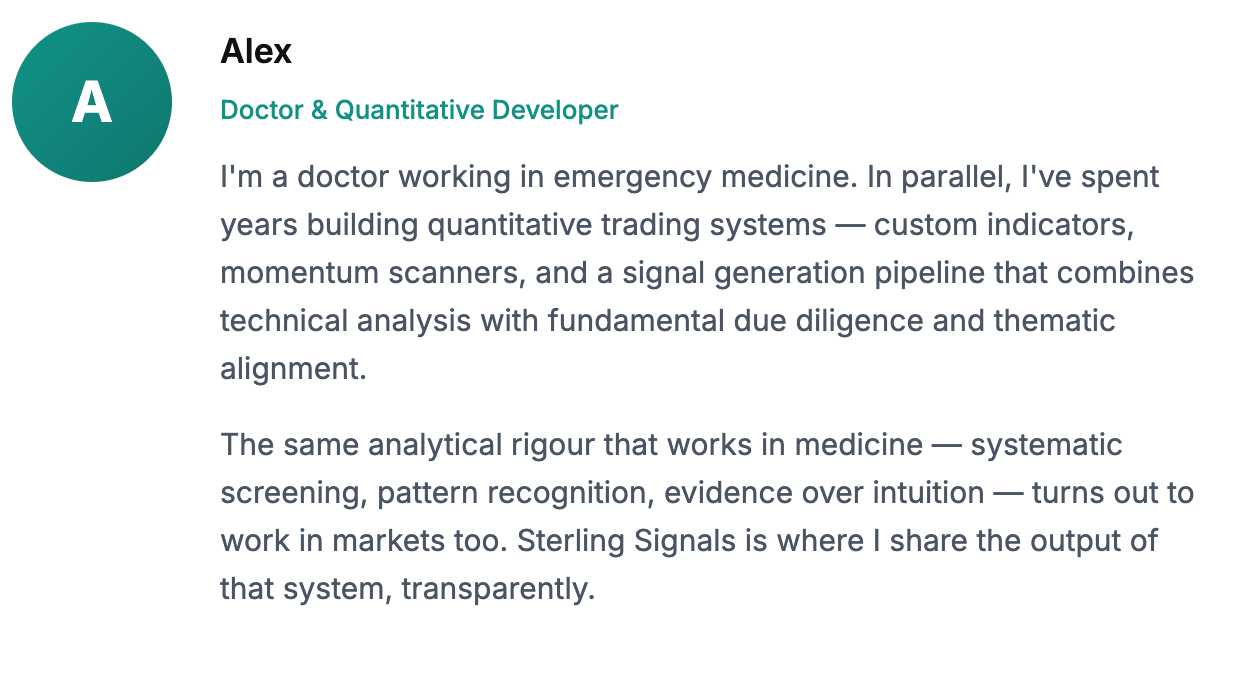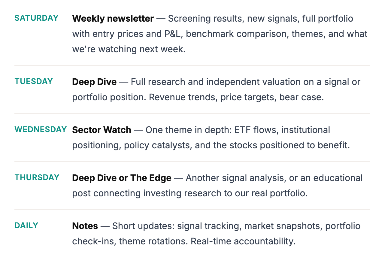 We screen 1,800+ US stocks weekly through a proprietary multi-stage system. When something passes, we publish the signal with a full entry price before Monday’s open. When it doesn’t work, you see that too.