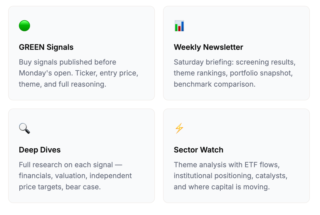 Every week, the scanner runs. You get the results — the signals that passed, the themes driving them, and a full portfolio update with every entry price and current P&L. No black box. No “trust me.” The numbers are right there