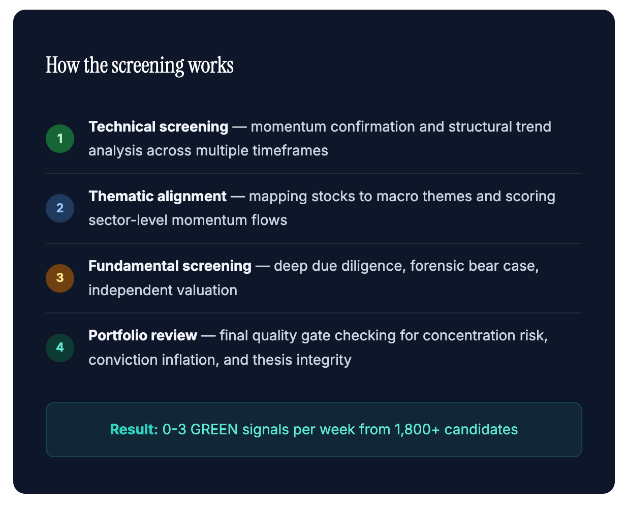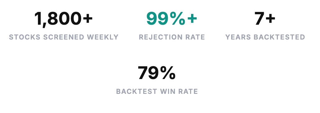 Signals aren’t opinions. They’re the output of a multi-stage screening process that filters 1,800+ stocks down to 0-3 per week. Most weeks, the system says no to everything. That selectivity is the edge.